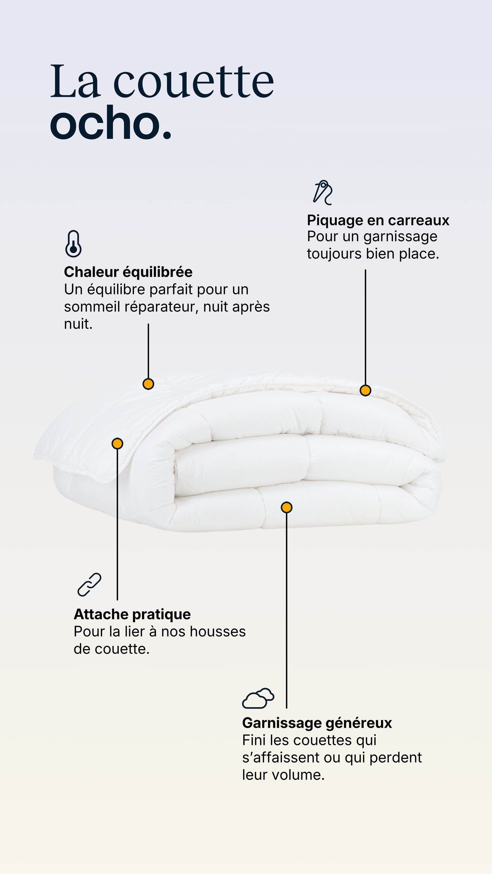 Toutefois, si vous avez tendance à avoir très chaud la nuit, nous vous conseillons plutôt d'opter pour notre version plus légère de notre couette : la ocho air.