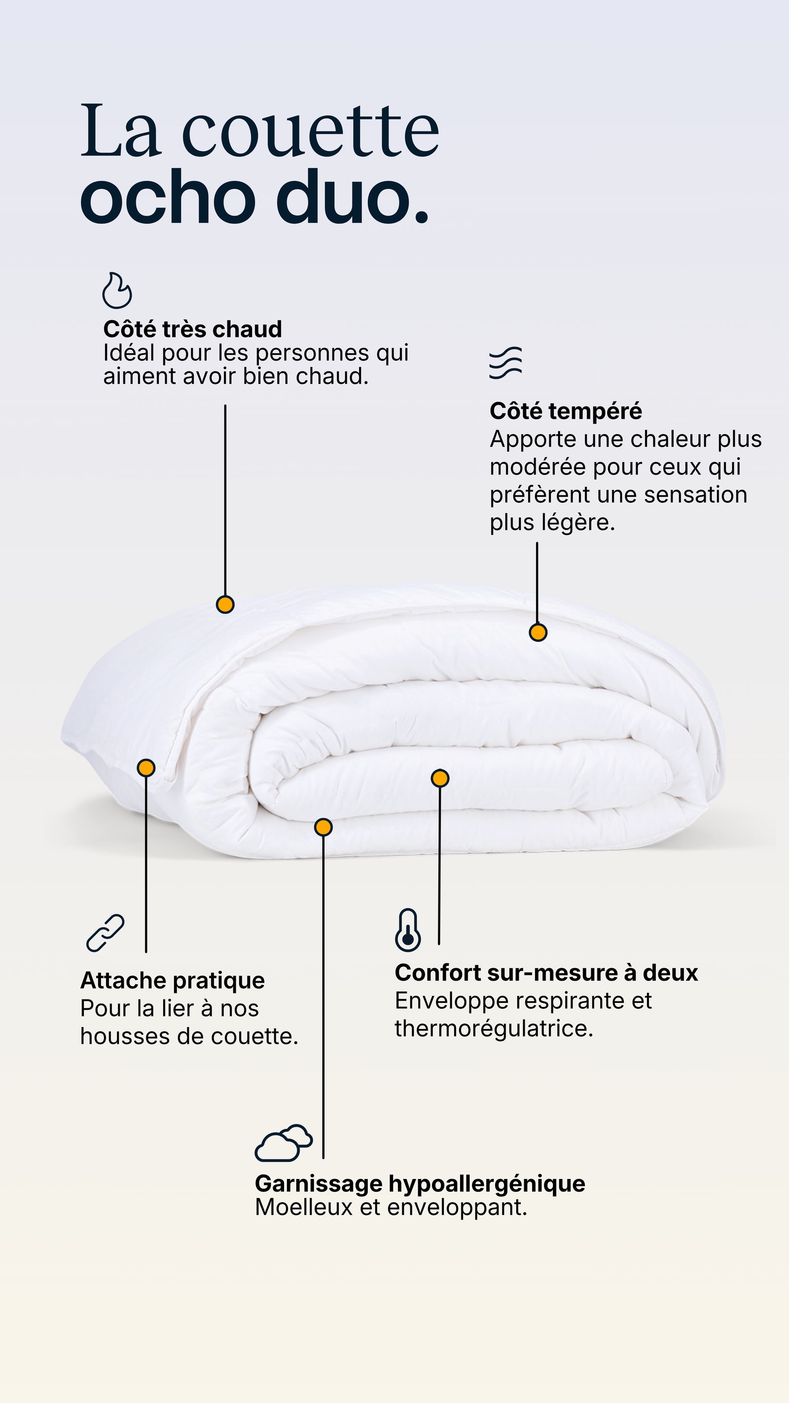 La couette ocho duo est une couette innovante conçue pour offrir un confort personnalisé grâce à ses deux moitiés avec des niveaux de chaleur différents.