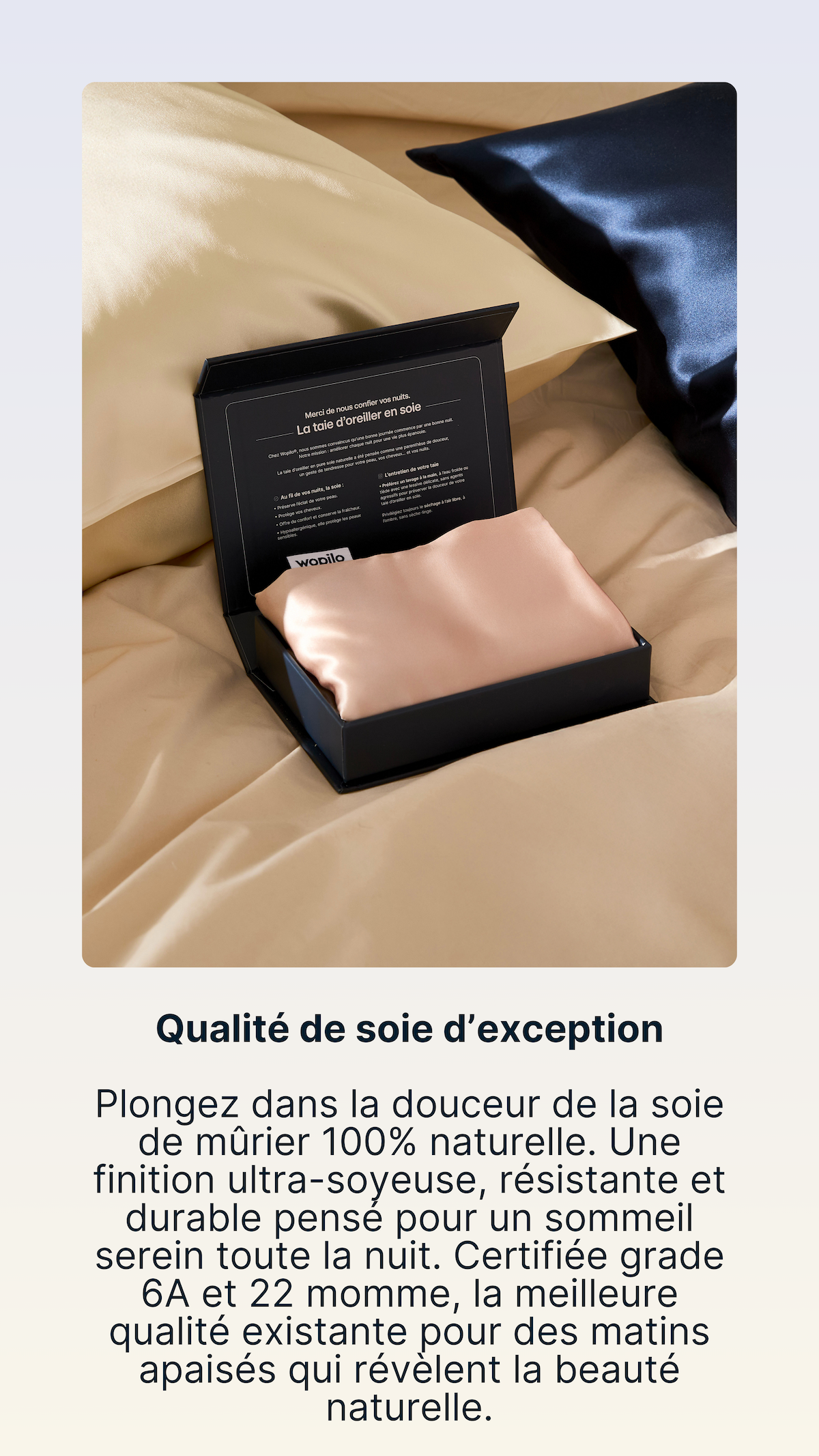 Avec la taie en soie Wopilo, le soin s'invite naturellement dans vos nuits. Enveloppante et délicate, elle agit en toute discrétion pendant le sommeil pour préserver l'hydratation, apaiser les peaux sensibles et limiter les frottements sur les cheveux. Chaque nuit devient un véritable moment de douceur, où le repos révèle l'éclat naturel de la peau.