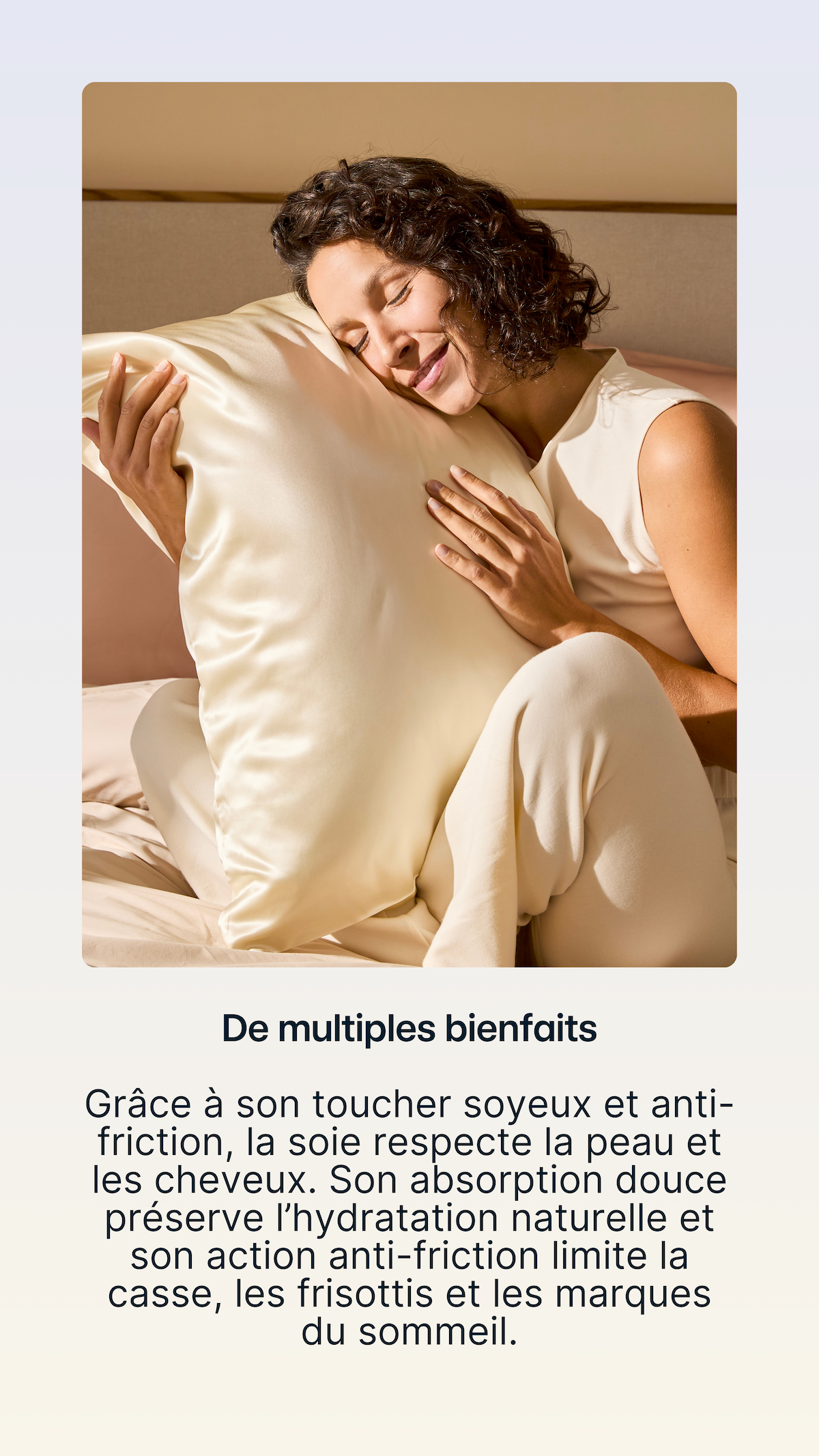 La soie ne traite pas l’acné, mais elle peut aider à apaiser les peaux sensibles, sujettes aux rougeurs ou aux imperfections. Son tissage satin limite les frottements, réduisant ainsi les irritations et les marques du sommeil.