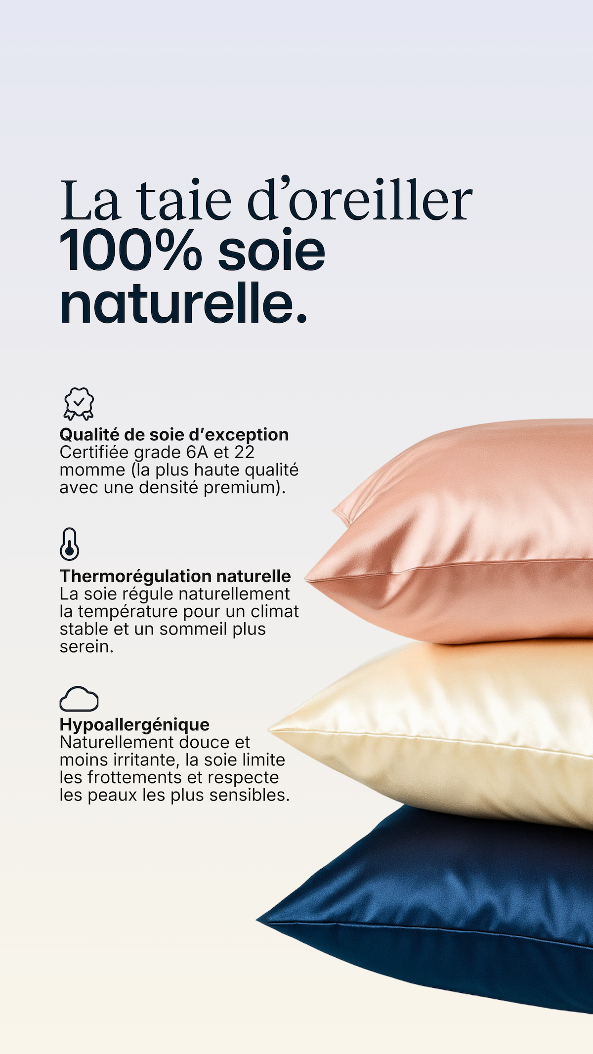 Plus le nombre de mommes est élevé, plus la soie est dense, résistante et naturellement douce. À 19 mommes, la soie offre déjà une sensation légère et agréable. À 22 mommes, on accède à un niveau premium : un équilibre idéal entre douceur, tenue et longévité, avec une meilleure résistance dans le temps et un toucher encore plus soyeux.
