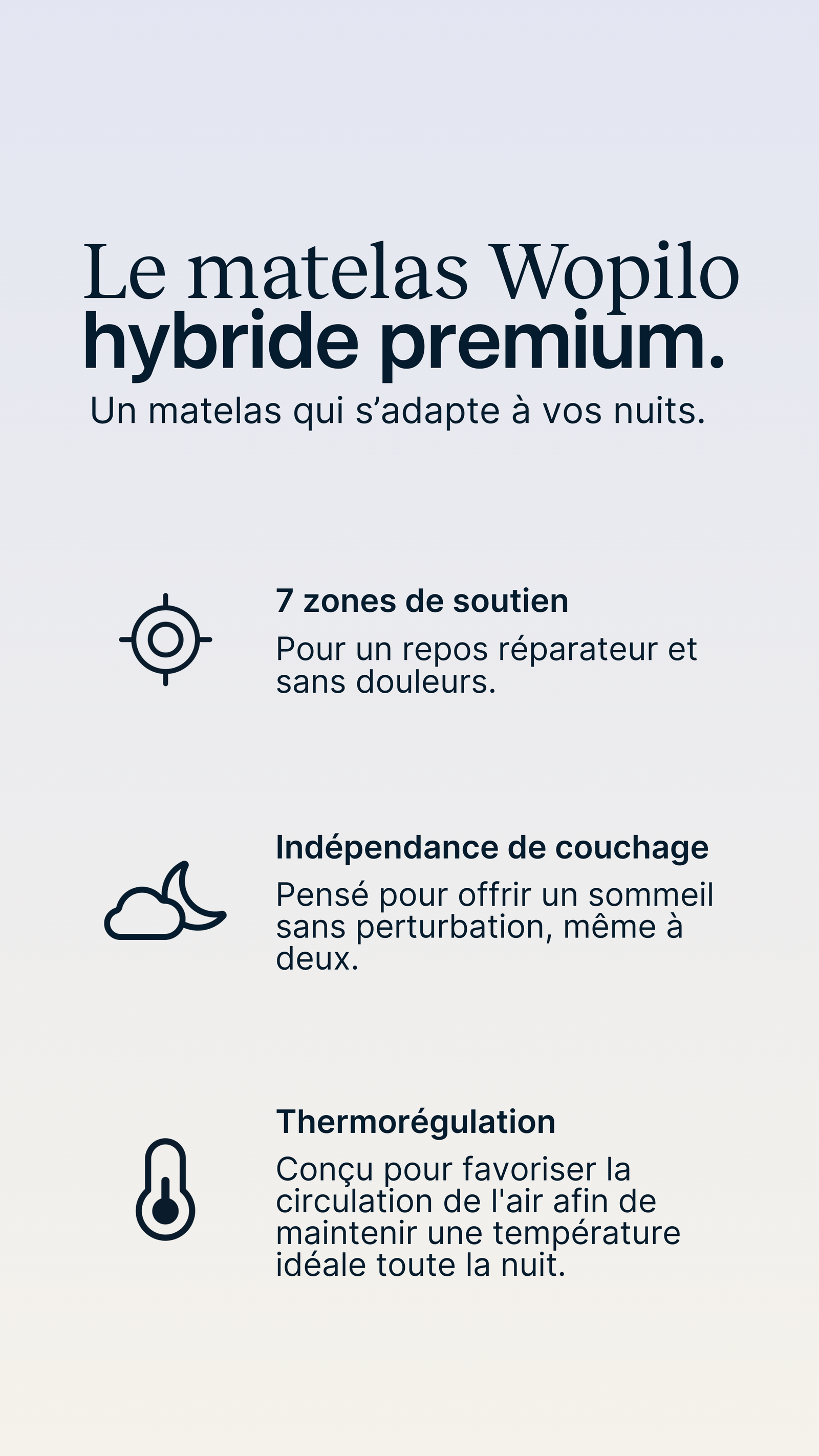 Nous gardons ce qui fait le succès des oreillers Wopilo : allier confort et soutien pour des nuits plus reposantes et des journées plus épanouies. Le matelas Wopilo va épouser votre corps, maintenir votre colonne vertébrale alignée et vous offrir une excellente indépendance de couchage.