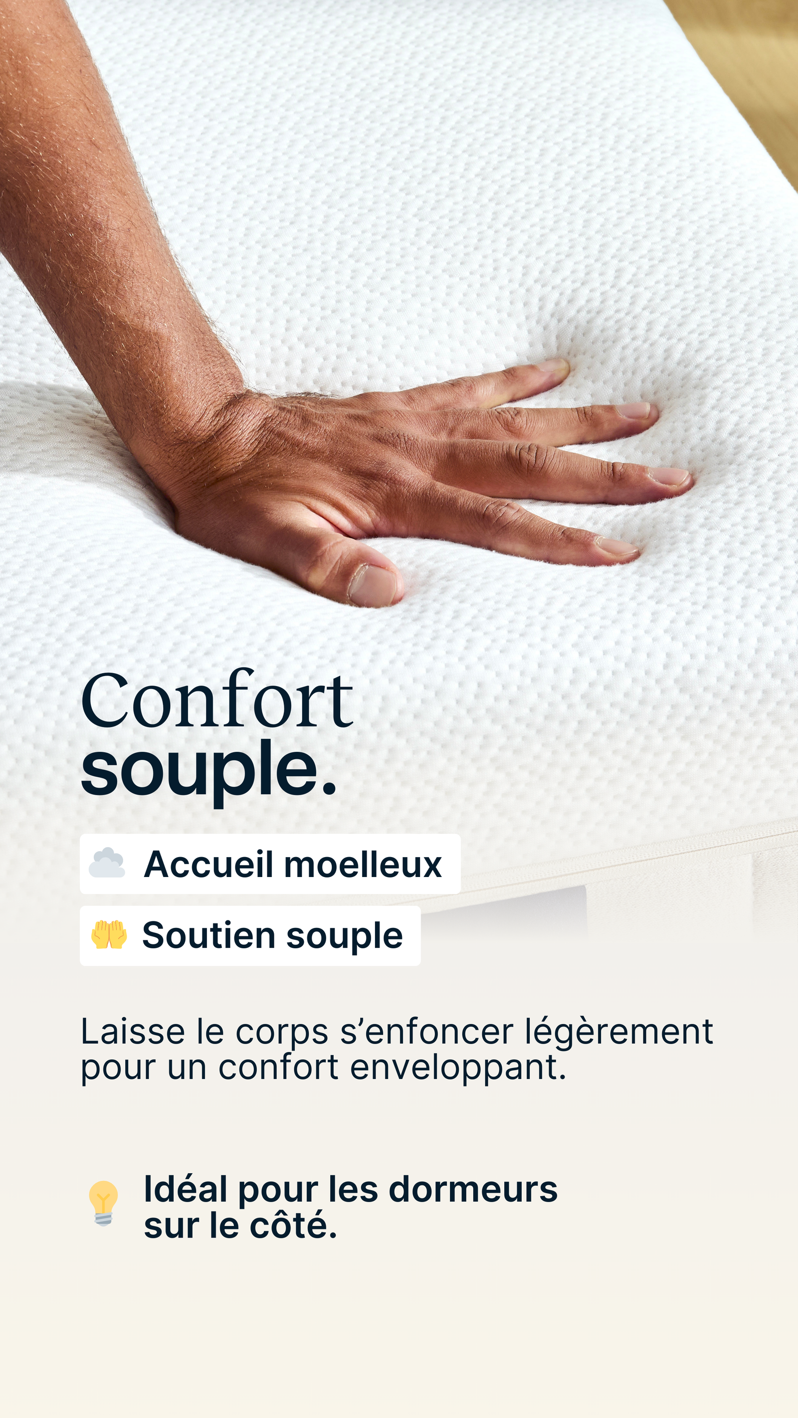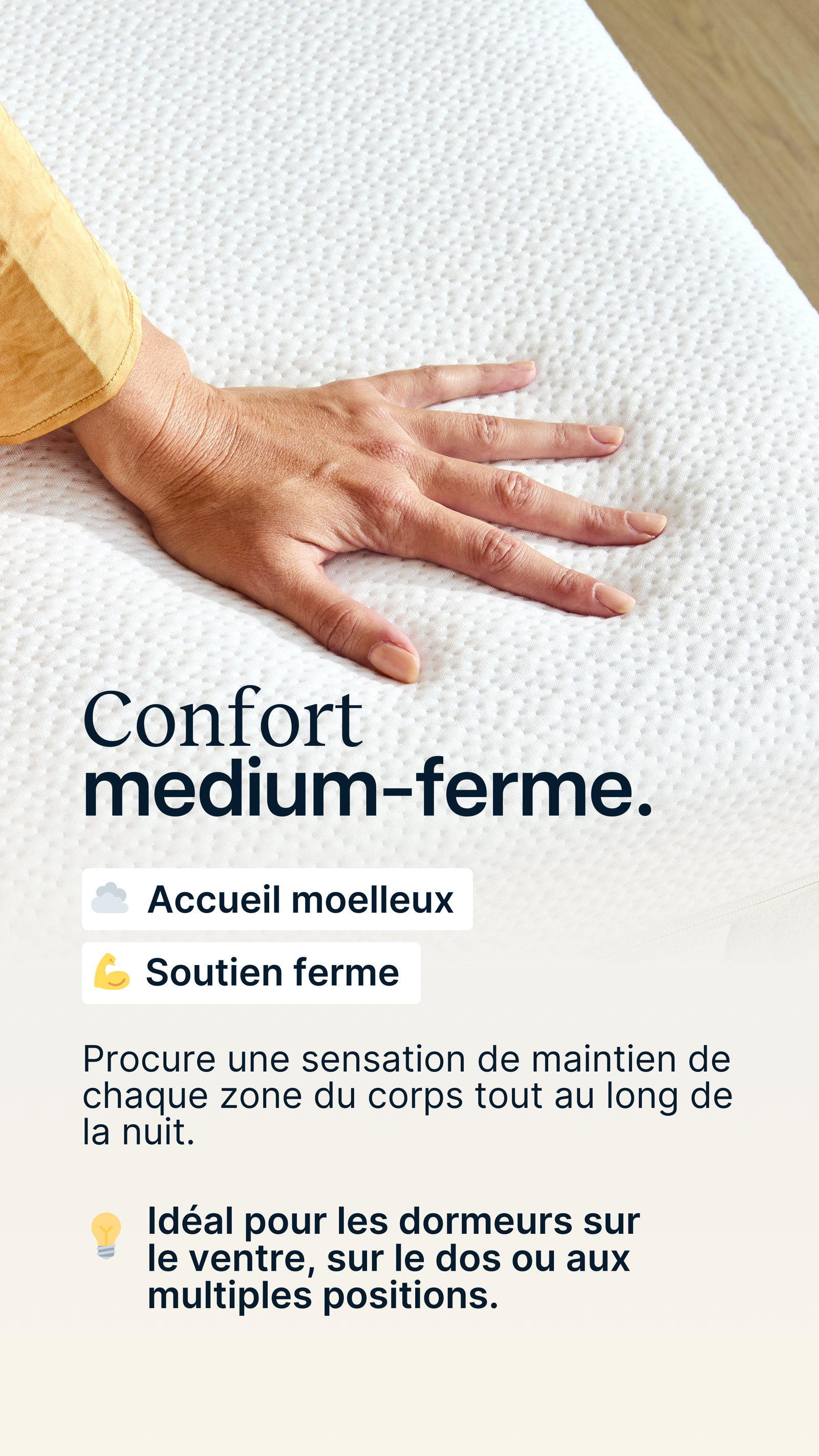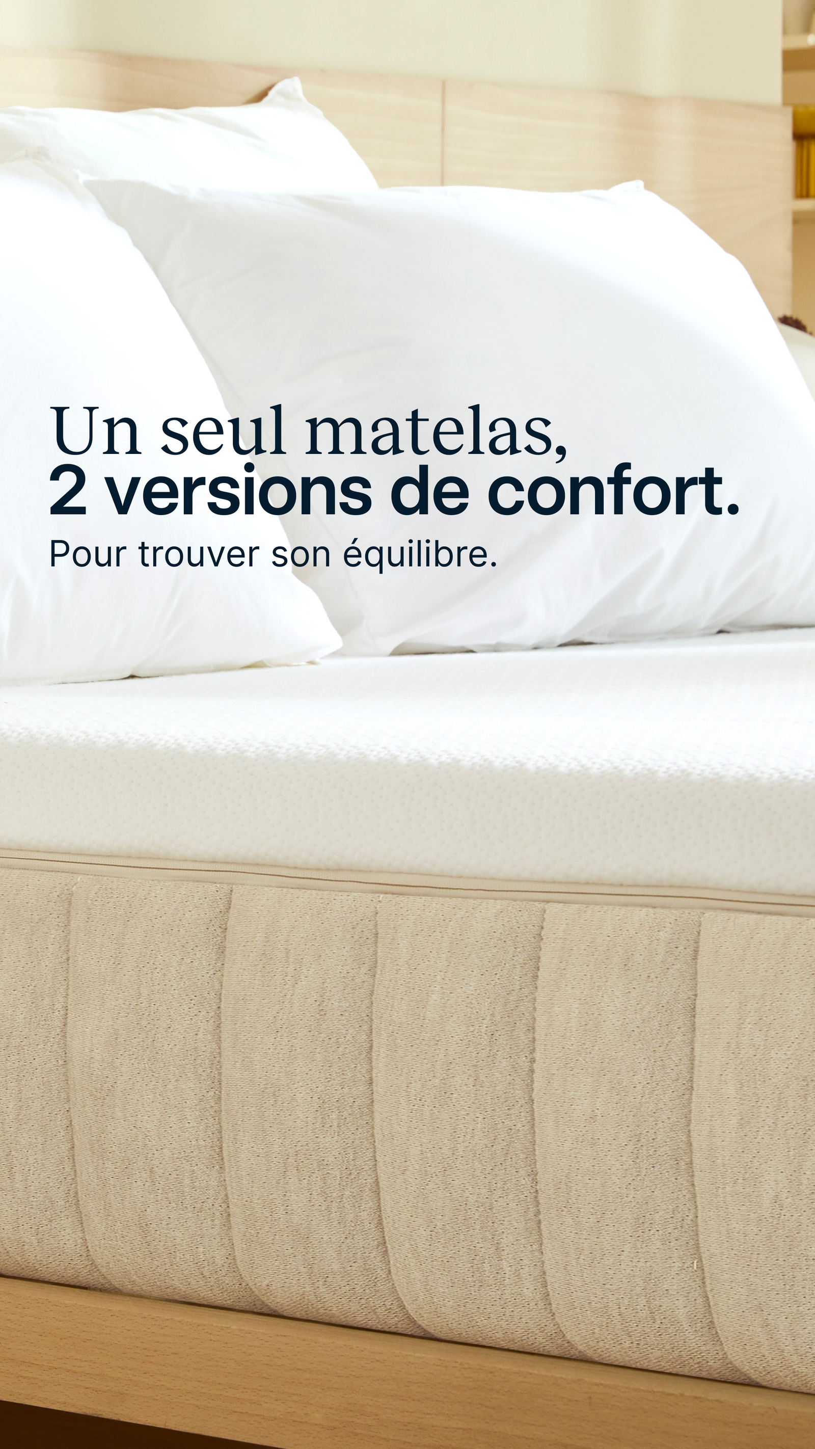 Ce matelas, c'est un an de recherche et développement avec les experts les plus pointus pour trouver l'équilibre parfait entre confort et soutien. Conçu pour s’adapter à chacun, il offre deux niveaux de confort (souple ou medium-ferme) afin de convenir à toutes les positions de sommeil et morphologies.