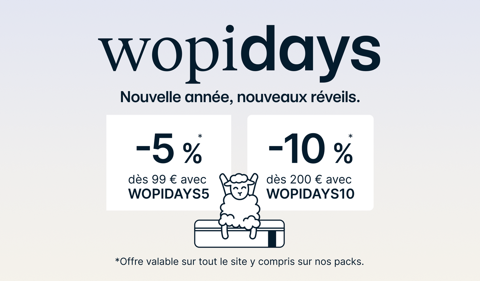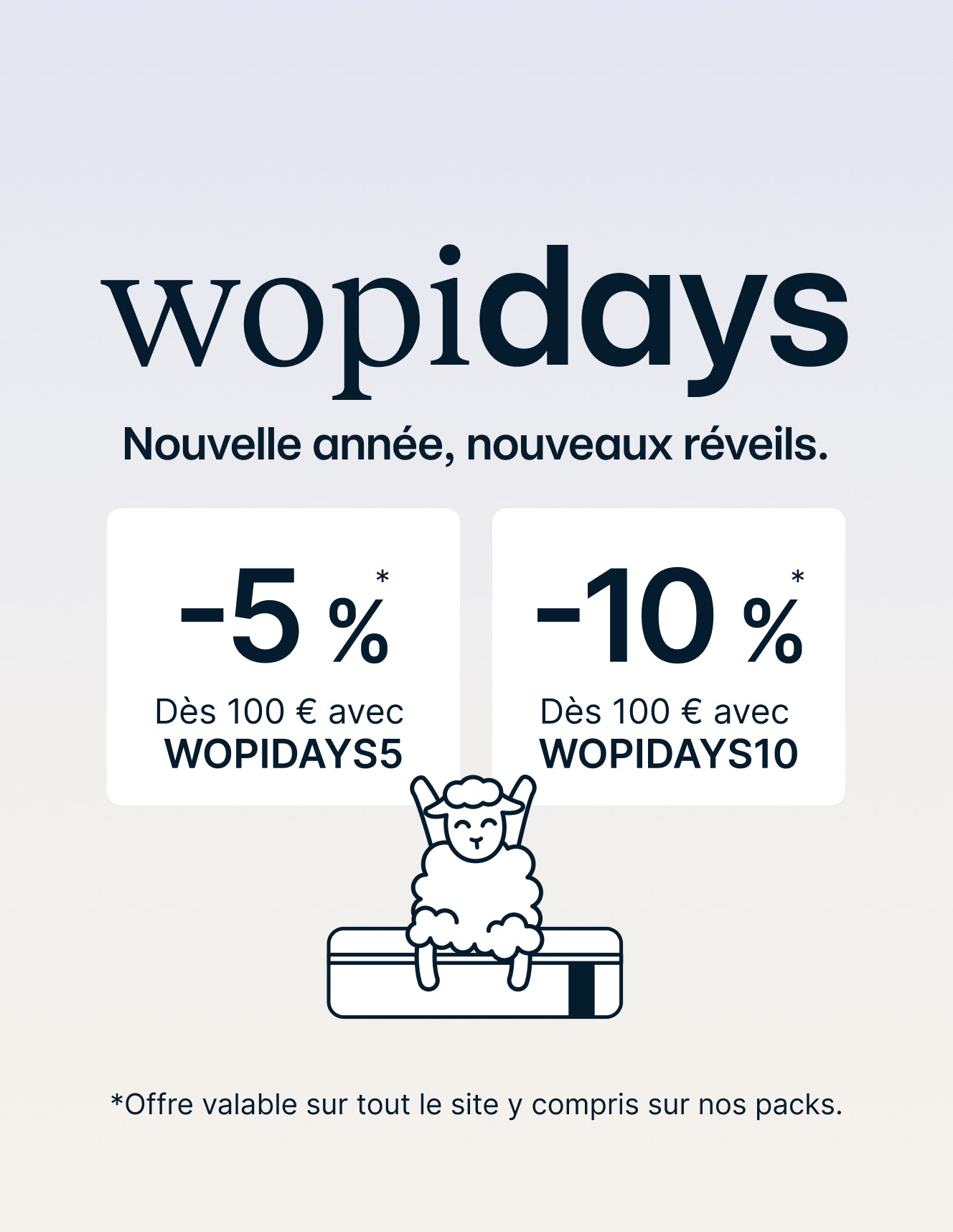 30 nuits d’essai sur nos oreillers et linge de lit, et 100 nuits pour nos matelas, têtes de lit ainsi que notre sommier. Prenez tout le temps qu’il vous faut pour adopter le confort Wopilo.