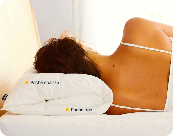Notre oreiller wopilo possède 2 poches d'épaisseur différente pour que vous puissiez choisir votre confort. Si vous recherchez de la fermeté, dormez sur la poche fine. Si vous recherchez plus de moelleux, retourner votre oreiller latéralement et dormez sur la poche plus épaisse.